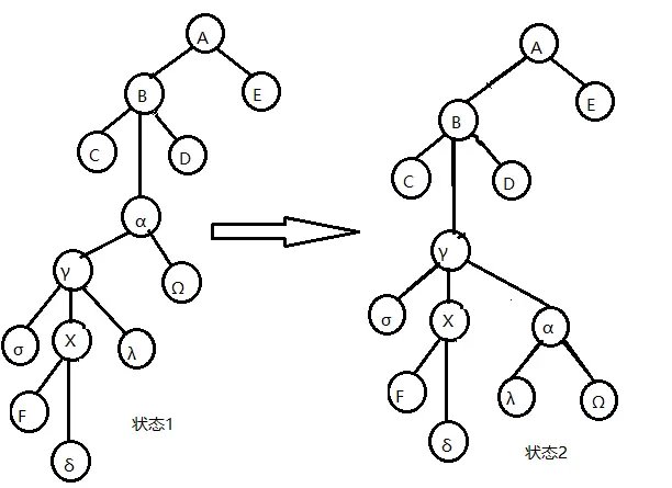 由图,易知由状态 1 到状态 2 的操作(将点 \(x\) 的父亲旋至其 Rake Tree 的根部的 Local Splay 操作)的均摊复杂度