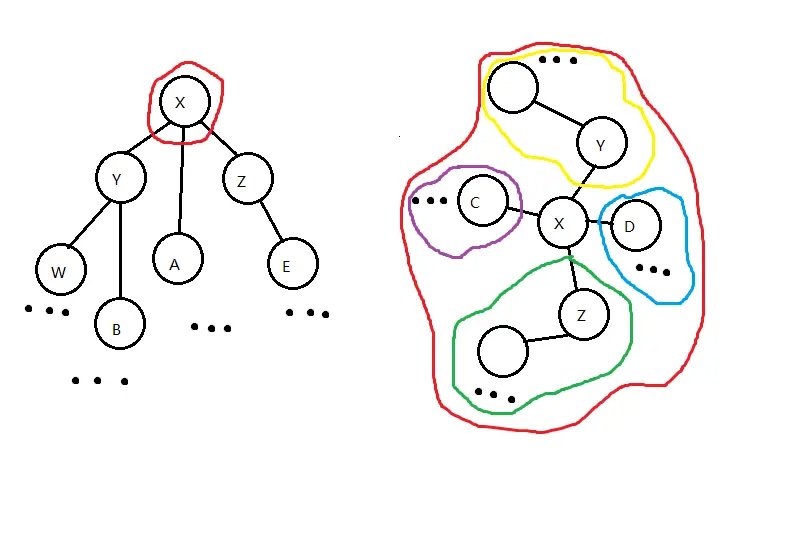 然而,如果我们选的点它在 Top Tree 中簇信息包含 \(x\) 的节点个数很少,也就是说使它的信息尽可能晚地加入簇中,我们单次操作的时间复杂度就会有一个很大的提升.如图.
