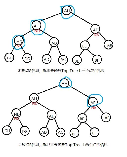 现在我们在维护时要对 \(T\) 中某个点 \(x\) 的权值进行修改,很明显,我们就需要更改 Top Tree 中所有簇信息包含 \(x\) 的节点信息,这样做单次时间复杂度会是 \(O(n)\) 级别的.