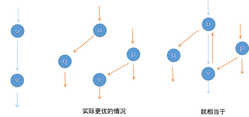 - 现在引入退流操作.第一次增广后,退流意味着 \(c_f(v, u)\) 增加了 \(1\) 剩余容量,即相当于新增 \((v, u)\) 这条边,因此我们可以再进行一次先后经过 \(p, v, u, q\) 的增广(如右图橙色路径所示).无向边 \((u, v)\) 上的流量在两次增广中抵消,我们惊奇地发现两次增广叠加得到的结果实际上和中图是等价的.