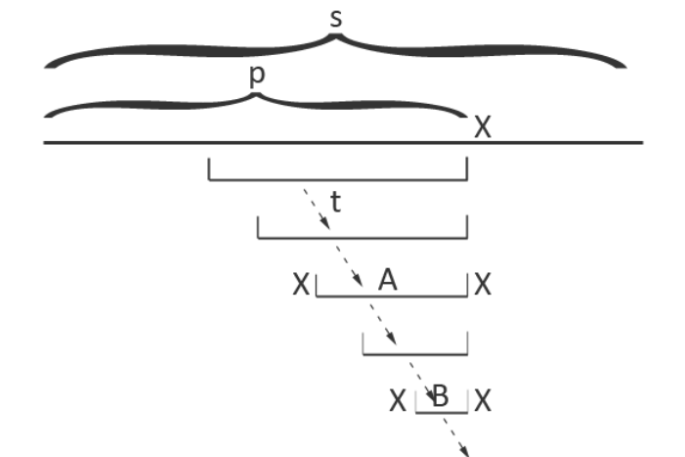 我们通过跳 fail 指针找到 A 所对应的节点,然后两边添加 X 就到了现在的回文串了(即 XAX),很显然,这个节点就是以 \(p\) 结尾的最长回文子串对应的树上节点.(同时,这个时候长度 \(-1\) 节点优势出来了,如果没有 X 能匹配条件就是同一个位置的 \(s_p=s_p\),就自然得到了代表字符 X 的节点.)此时要判断一下:没有这个节点,就需要新建.