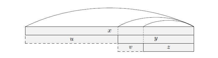 - 因为 \(y\) 是 \(x\) 的 border,所以 \(v\) 是 \(x\) 的前缀,设字符串 \(w\),满足 \(x=vw\)(如下图所示),其中 \(z\) 是 \(w\) 的 border.考虑反证法,假设 \(|u| \le |z|\),那么 \(|zu| \le 2|z|\),所以由引理 \(2\),\(w\) 是回文串,由引理 \(1\),\(w\) 是 \(x\) 的 border,又因为 \(|u| > |v|\),所以 \(|w| > |y|\),矛盾.所以 \(|u| > |z|\).