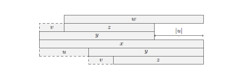 - 由引理 \(3\) 的推论,\(|u|=|x|-|y|\) 是 \(x\) 的最小周期,\(|v|=|y|-|z|\) 是 \(y\) 的最小周期.考虑反证法,假设 \(|u| < |v|\),因为 \(y\) 是 \(x\) 的后缀,所以 \(u\) 既是 \(x\) 的周期,也是 \(y\) 的周期,而 \(|v|\) 是 \(y\) 的最小周期,矛盾.所以 \(|u| \ge |v|\).