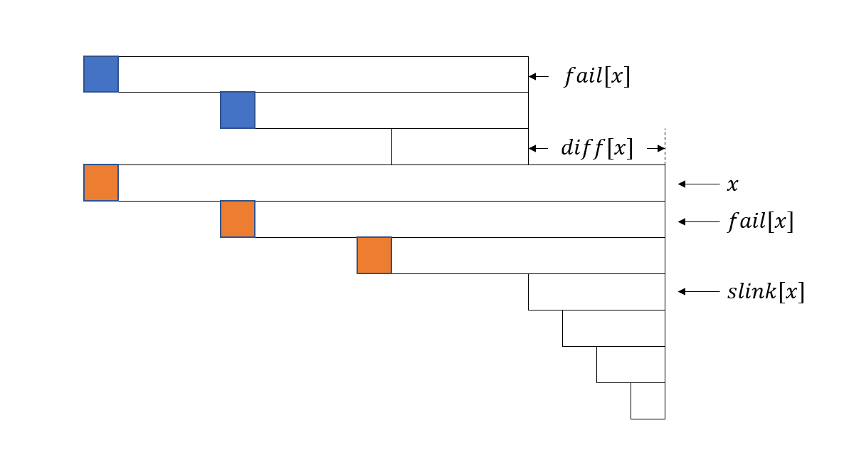 根据引理 \(1\),\(fail[x]\) 是 \(x\) 的 border,因此其在 \(i-diff[x]\) 处出现.