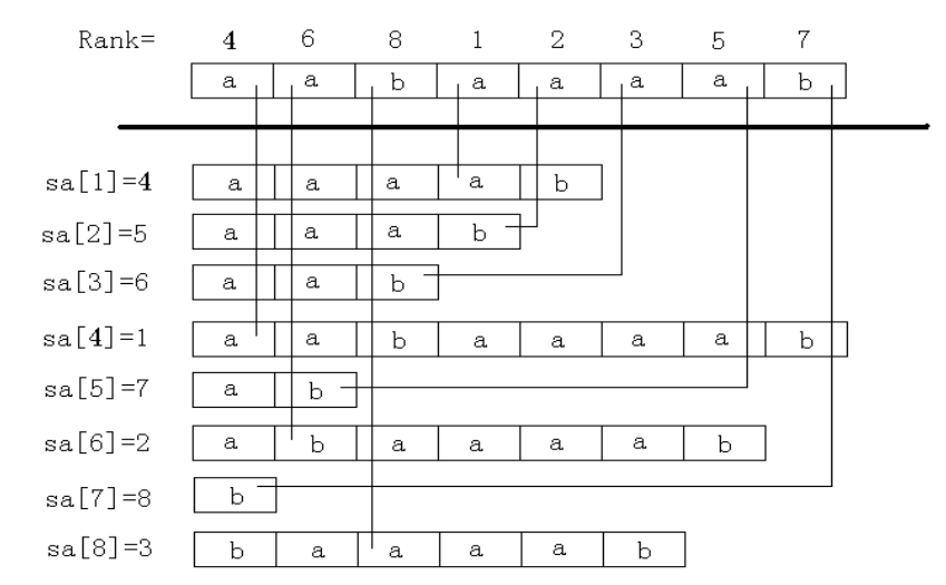 这两个数组满足性质:\(sa[rk[i]]=rk[sa[i]]=i\).