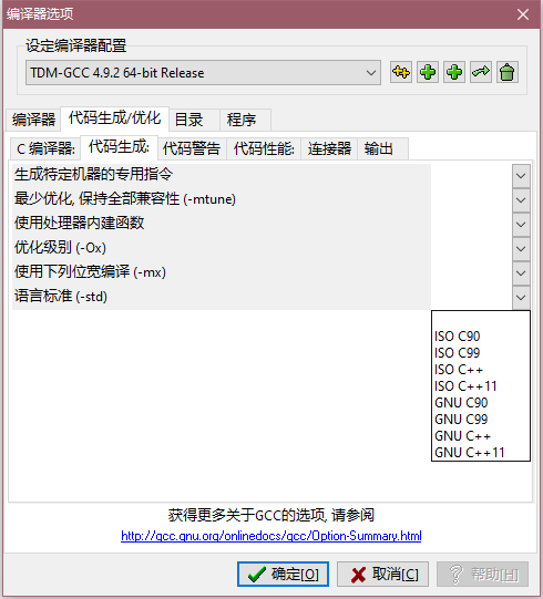 选择 "代码生成" 子选项卡中的 "语言标准(-std)" 选项标签.