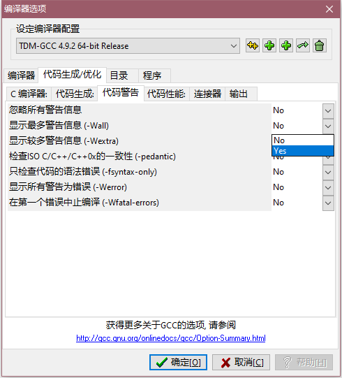 选择 "代码警告" 子选项卡中的 "显示最多警告信息(-Wall)" 选项标签.