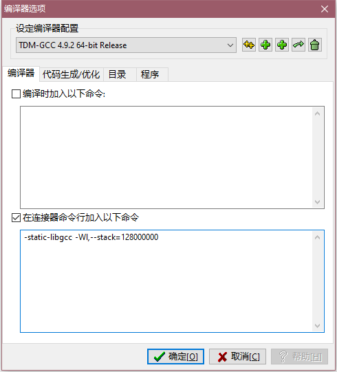 在 "连接器命令行加入以下命令" 中加入 -Wl,--stack=128000000 命令.